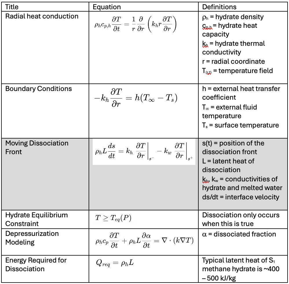 A critical component for this model (and really the equation that determines how fast the hydrate dissociates) is at the phase boundary (shaded equation in the table), which is moving. The final solution is presented (hydrate is fully dissociated) when