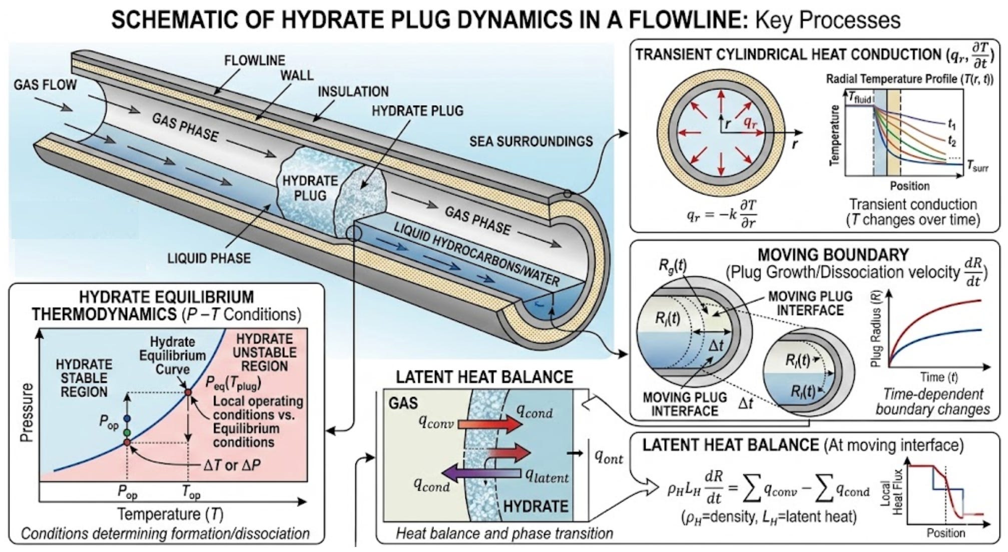 Chemicals will shift the equilibrium curve. Depressurizing the system or providing latent heat will move the system’s thermodynamics relative to the hydrate equilibrium curve. One must, obviously, consider kinetics when asking how quickly a hydrate plug will form or melt. Colorado School of Mines Hydrate Plug Dissociation Tool (CSMPlug) predicts how quickly a hydrate plug will dissociate by solving transient heat-transfer and moving boundary (Stefan-type) problems with hydrate thermodynamic equilibrium constraints.