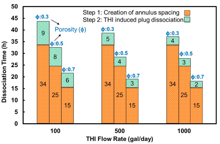 Let’s also assume there is only 85% effective heat applied, so P = 6,375 W. The same energy is required to dissociate the hydrate, which makes the time requirement