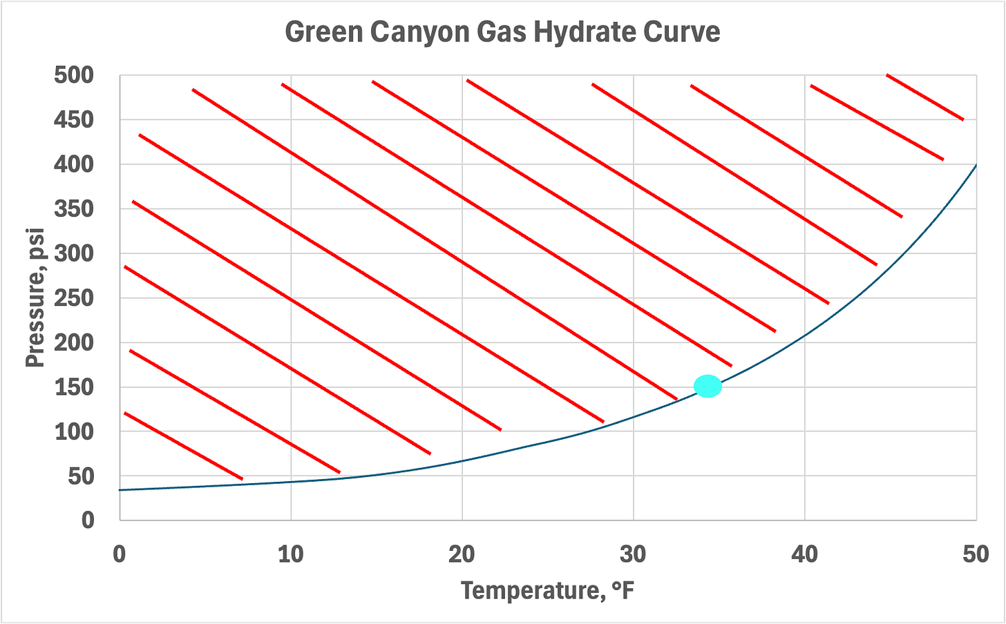 Another important factor to consider is when pressures become very low (for a subsea tieback). Let’s consider a system that has managed to be blown down to 150 psi. The hydrate equilibrium temperature for Green Canyon Gas (a representative Gulf of America gas composition) is shown below. At equilibrium the system will slowly warm to 40°F by the surrounding ambient temperature, which will melt the hydrates. This will, in turn, cool the system down below freezing temperatures. The operation then risks ice formation!
