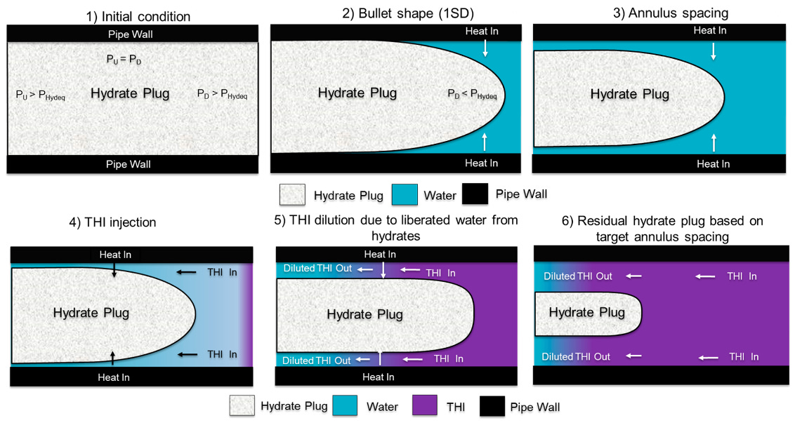 In 2024, Koh et al. reported a model to describe a two-step mechanism to dissociate a hydrate plug. In the first step, heat is applied to begin the hydrate dissociation process and create annulus spacing between the pipeline wall and the hydrate plug (images 1 - 3 below; this is critical as one needs to establish communication across the plug). In the second step (images 4 - 6), THI is delivered to one side of the hydrate to accelerate the dissociation of the hydrate.