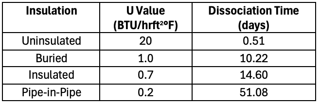 If there is a more effective insulation and the heat transfer value is only 3 W/m2K (0.52 BTU/hr.ft2.°F), the dissociation time increases to 20 days. Technology giveth and technology taketh away! What was preserving thermal energy from the reservoir to carry along the flow line is now severely limiting thermal transfer from the seabed temperature into the system. This obviously helps to reduce the risk of hydrate formation, however once hydrates are present the remediation becomes more challenging. The chart showing various flow line insulations below highlights the differences and drives the point home.