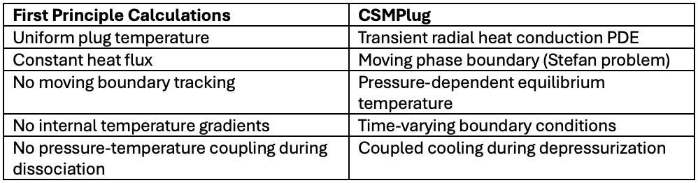 Long plug lengths – For very long plugs, pressure gradients matter more and dissociation may start at the ends. Lastly, melt rates are not uniform. A simplified model will under or over predict the dissociation time by up to 2x in some cases.