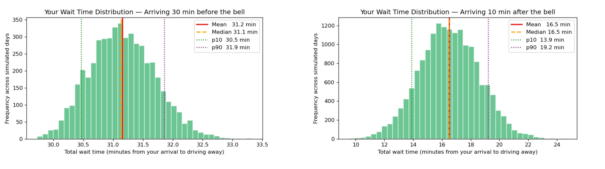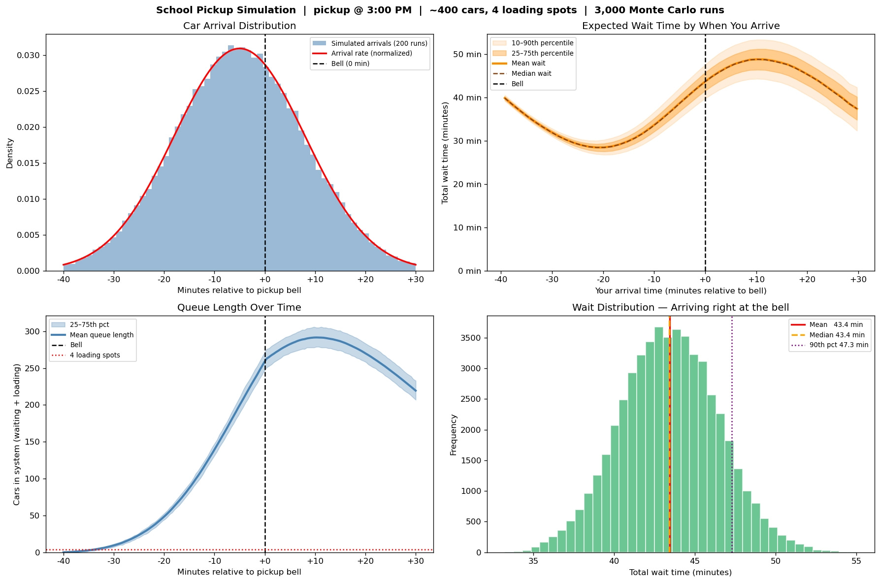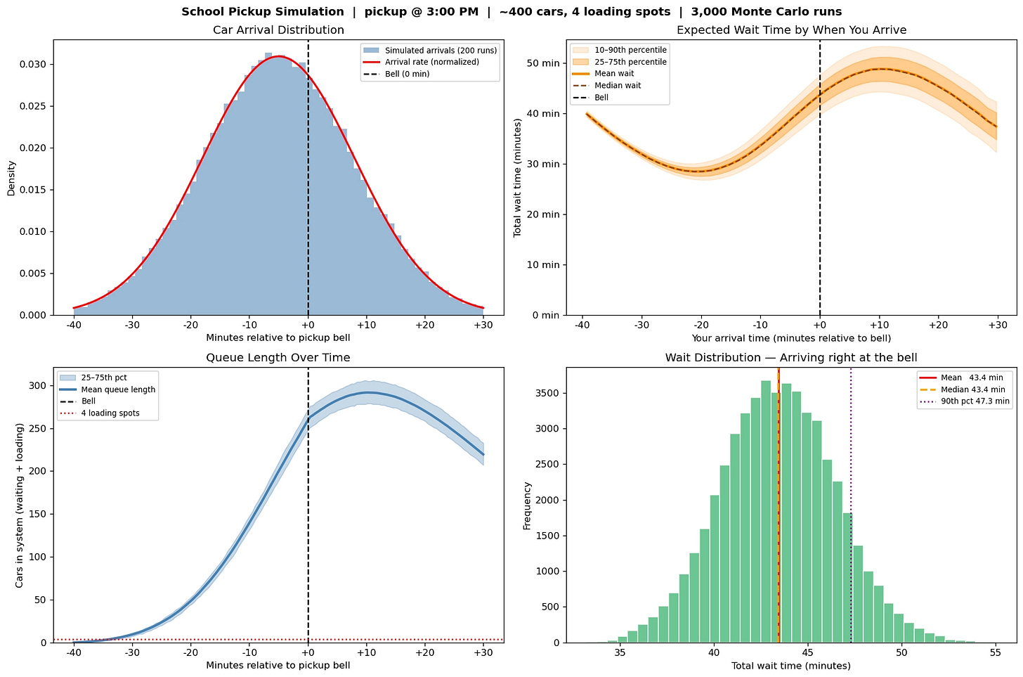 I then ran 3,000 Monte Carlo simulations — each one representing a full school day — to build up a statistical picture of wait times across every possible arrival time.