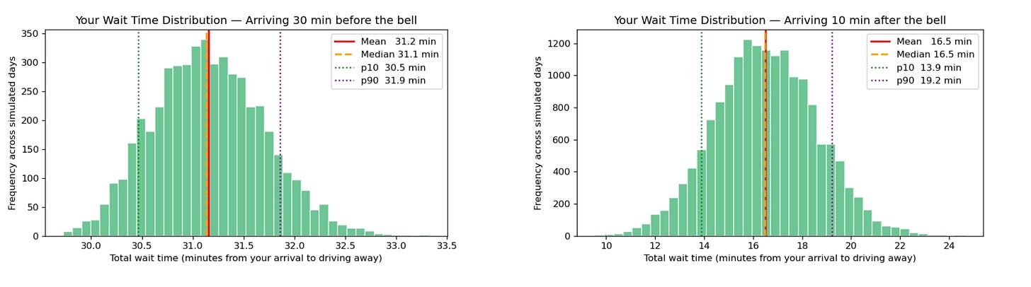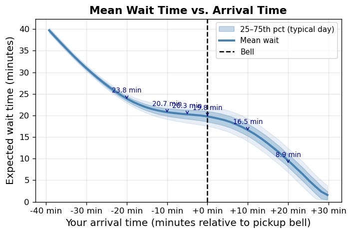 The magic spot: if you wait it out and arrive 10 minutes after the bell, your average wait drops to just 16 minutes which is shorter than someone who arrived 20 minutes early.