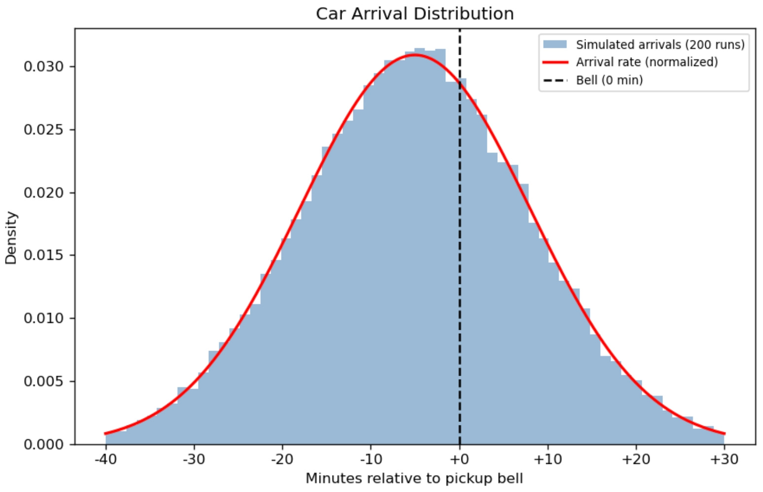 Cars arrive randomly following a non-homogeneous Poisson process — meaning they don’t all show up at once, but cluster around the bell in a bell-shaped pattern (no pun intended). The peak arrival rate actually hits about 5 minutes before the official pickup time.